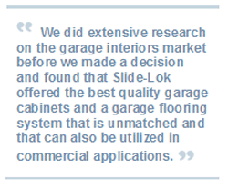 WellsCo Enterprises will operate Slide-Lok of Houston. Scott Bair, vice president of sales and operations for WellsCo Enterprises stated, “This was a natural evolution for us. We realized that the garage cabinets, garage floor coatings, and garage interiors industry had become a booming market, and we knew that Slide-Lok would be a perfect fit.” With Slide-Lok offering durable plywood cabinets and a revolutionary one-day garage floor coating system, Bair felt that WellsCo Enterprises had found an ideal partner in Slide-Lok and added, “We did extensive research on the garage interiors market before we made a decision and found that Slide-Lok offered the best quality garage cabinets and a garage flooring system that is unmatched and that can also be utilized in commercial applications.” Bair also commented, “Slide-Lok offers unparalleled dealer support, which was a big factor in our decision. We are very pleased to be a Master Dealer of their products.”