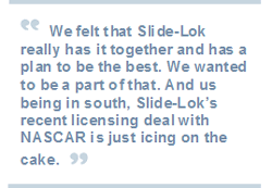 Slide-Lok’s unmatched marketing and dealer support has been well documented, and it was no different when it came to establishing Slide-Lok of Nashville. Bradford explained, “We love the products Slide-Lok offers. But, even more so, we were amazed at how Slide-Lok makes it so easy to do business. We felt that Slide-Lok really has it together and has a plan to be the best. We wanted to be a part of that. And us being in south, Slide-Lok’s recent licensing deal with NASCAR is just icing on the cake. We think the new product launch will be a definite hit in our area. Our excitement level went through the roof after we visited the corporate headquarters in Tempe.”