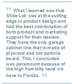 Malcolm Reding, owner of Slide-Lok of SE Florida, brings over 20 years of experience in marketing and sales with two Fortune 500 companies and has spent the past 25 years in small scale commercial and residential real estate development. In Reding’s pursuit to find the best home storage company, he diligently researched several companies in this competitive industry. Reding spoke with several Slide-Lok Master Dealers in Florida and across the country. His research and conversations confirming Slide-Lok’s superiority in the garage interiors and home storage industries, Reding stated, "What I learned was that Slide-Lok was at the cutting edge in product design and had the best combination of both product and marketing support for their dealers. They have the only garage cabinet line that is made of plywood and not particle board. This, I concluded was paramount because of the high humidity level we have in Florida. I have close personal experience with the unsuitability of particle board cabinets in this environment. Together with their garage floor coating system, Slide-Lok has the perfect combination of design, quality and support for Florida homeowners.”