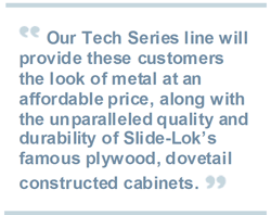 Jason Jantzen, Slide-Lok’s marketing director, added, “Our research indicated that a large unserved portion of the garage interiors market are those customers who desire the look of metal garage cabinets.” Jantzen added, “Our Tech Series line will provide these customers the look of metal at an affordable price, along with the unparalleled quality and durability of Slide-Lok’s famous plywood, dovetail constructed cabinets.”