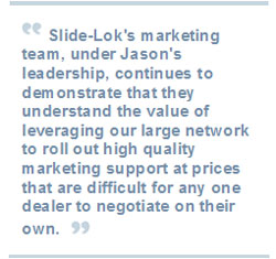 Brian Strayer, president of Slide-Lok, added “We know that a key goal in differentiating ourselves from the competition is to provide best in class training and marketing support to our dealer network.” Strayer added, “Slide-Lok’s marketing team, under Jason’s leadership, continues to demonstrate that they understand the value of leveraging our large network to roll out high quality marketing support at prices that are difficult for any one dealer to negotiate on their own.”